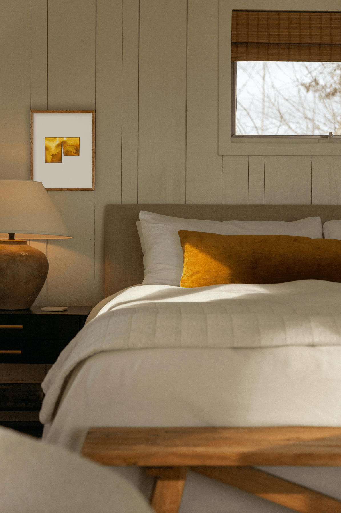 Renk: Hardal sarısı tonlu desen / Kırık beyaz paspartu / Meşe rengi ham ahşap çerçeve.