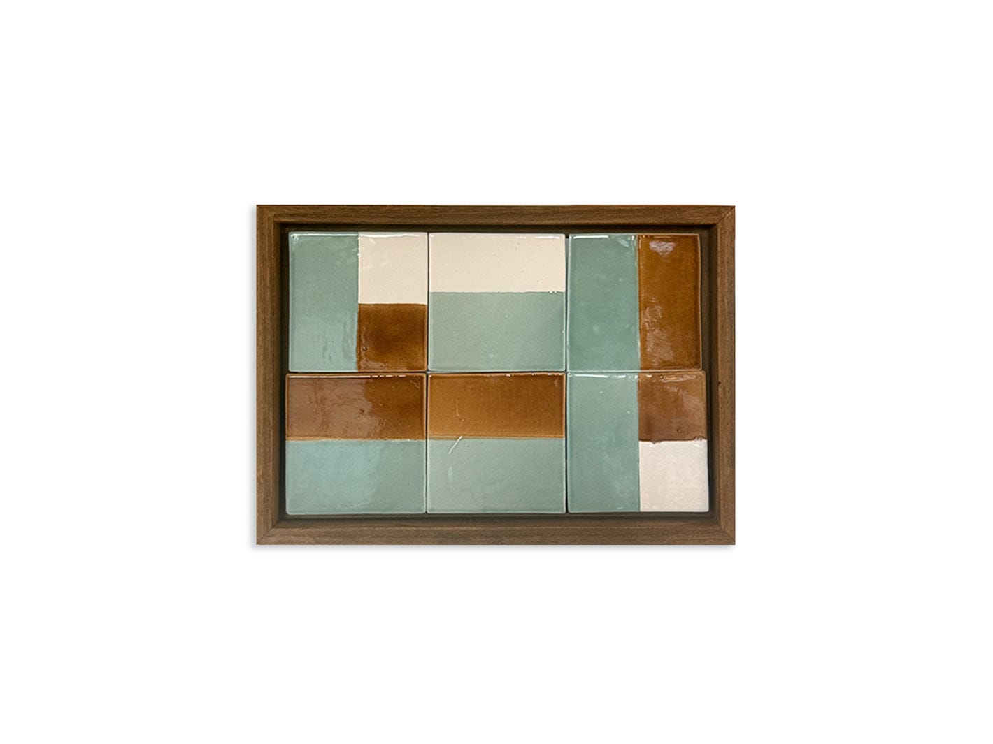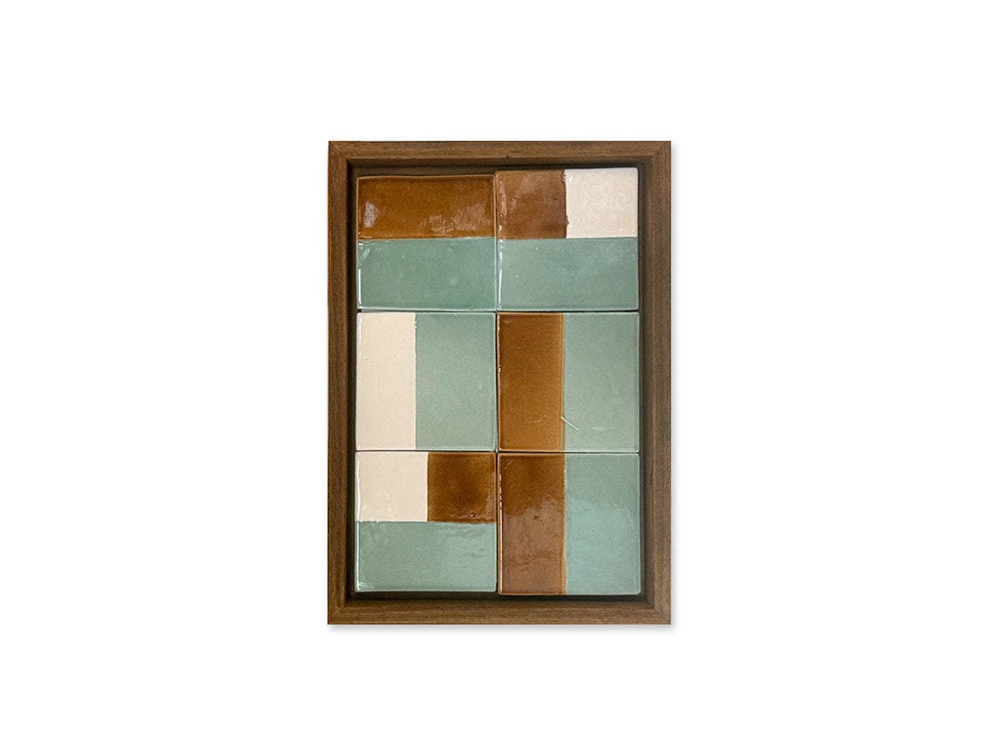 Each ceramic stone makes the artwork unique with its natural surface texture and subtle color variations. The natural wooden frame complements the modern character of the ceramic, offering a warm and timeless appearance.